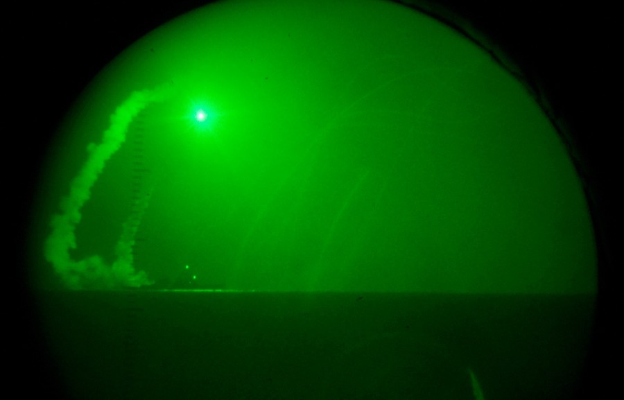 Read moreSeen through night-vision lenses aboard amphibious transport dock USS Ponce (LPD 15), guided missile destroyer USS Barry (DDG 52) fires Tomahawk cruise missiles in support of Operation Odyssey Dawn in the Mediterranean Sea on March 19, 2011. This was one of approximately 110 cruise missiles fired from U.S. and British ships and submarines that targeted about 20 radar and anti-aircraft sites along Libya's Mediterranean coast. #