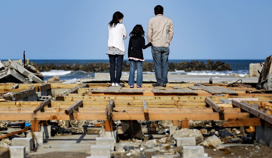 Read moreTsutomu Murai, 31, right, with his wife Makiko, 28, and daughter Haruna, 8, watch the Pacific Ocean as they stand on the basement of their house washed out by tsunami wave in the area devastated by the March 11 tsunami and earthquake in the town of Soma, Fukushima Prefecture, Japan, Sunday, April 24, 2011. #