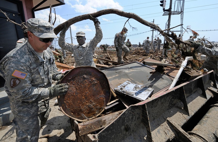 Read moreUS and Japanese soldiers prepare to clear debris left by the March 11 earthquake and tsunami from the tracks around Rikuzenono Station in Higashimatsushima, Miyagi Prefecture, on April 24, 2011. Some 60 US and 30 Japanese soldiers took part in the clean up "Operation Soul Train." #