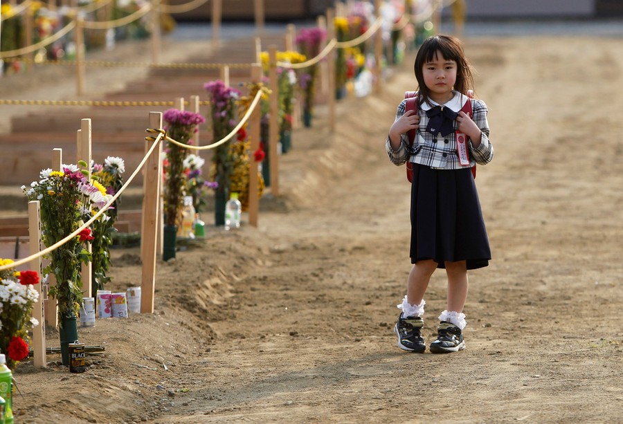 Read moreWakana Kumagai, 6, waits for her mother Yoshiko after visiting the grave of her father, who was killed by the March 11 tsunami, at a temporary mass grave site in Higashi-Matsushima, Miyagi prefecture, April 21, 2011, after attending an entrance ceremony of Omagari elementary school. #