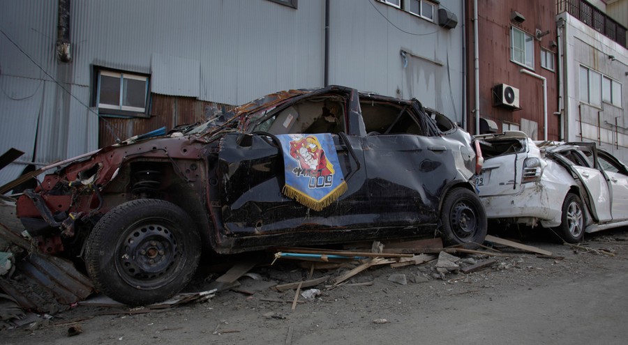 Read moreA wrecked car carries a flag of Shotaro Ishinomori's cartoon character "Cyborg 009" at a devastated area by the March 11 tsunami in Ishinomaki, Miyagi Prefecture, northeastern Japan, Thursday, May 5, 2011. Nearly two months after their lives were turned upside down by the massive tsunami, the boys and girls of Ishinomaki, many who live still live in shelters or half-ruined homes surrounded by debris, were treated to a stage show of cartoon characters as part of the country's annual Children's Day celebrations. #
