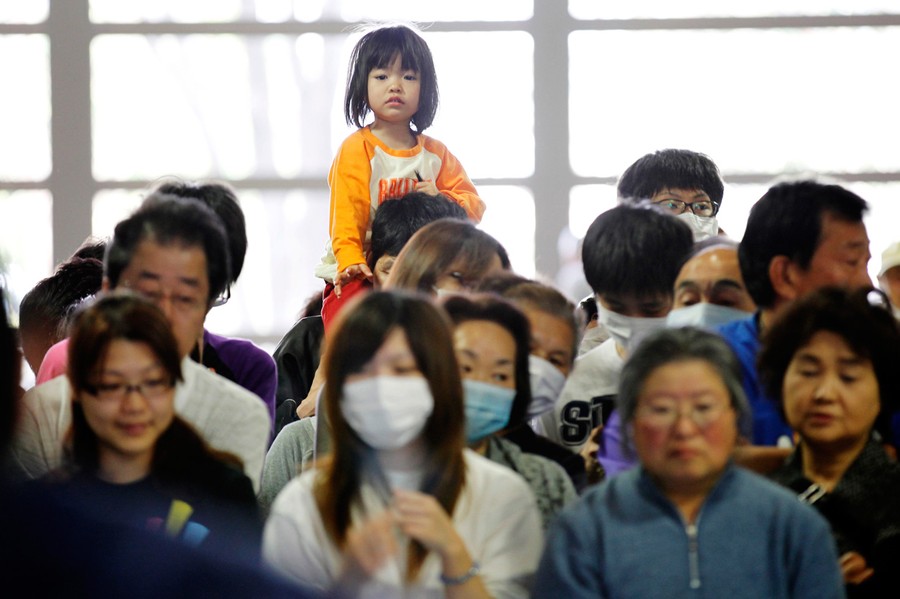 Read moreA girl carried on the shoulders of a man waits along with other evacuees to receive donated clothes distributed at an evacuation center in Fukushima, northeastern Japan, on Saturday, April 16, 2011. #