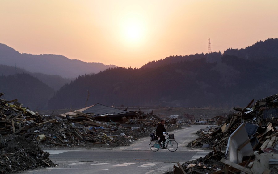 Read moreA man cycles among the rubble in an area devastated by the Match 11 earthquake and tsunami in the town of Rikuzentakata, Iwate Prefecture, Japan, Thursday, April 14, 2011. #