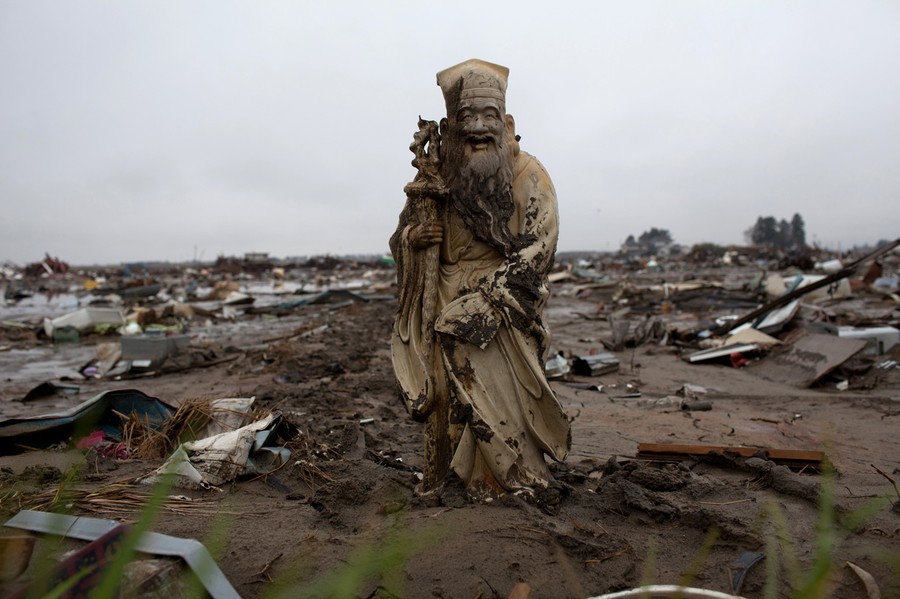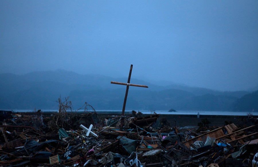 Read moreA wooden cross stands amid the tsunami devastation at a place where a church used to stand in Kesennuma, Miyagi prefecture on April 22, 2011. Japan, on April 22, 2011. #