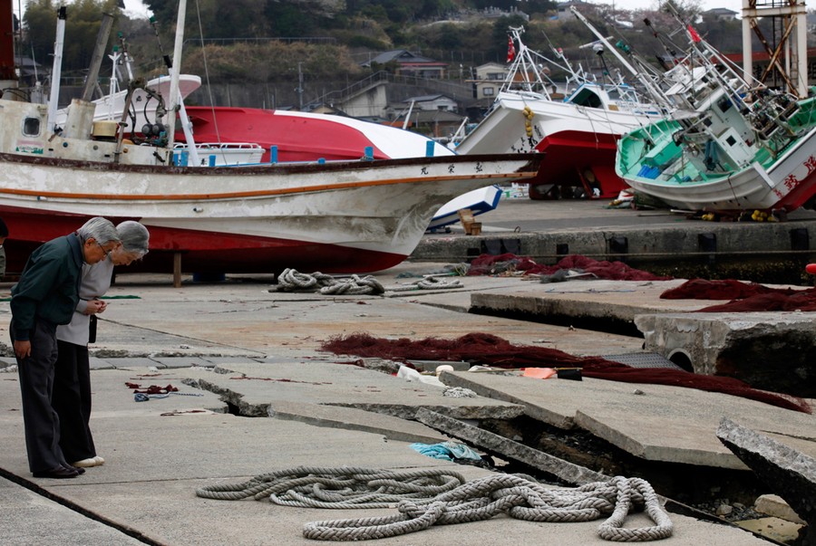 Read moreJapan's Emperor Akihito and Empress Michiko pay tribute to those killed by the deadly earthquake and tsunami last month as they look around a damaged fishing port in Otsu town in Kitaibaraki, about 70 km (42 miles) south of the crippled Fukushima Daiichi Nuclear Power Station, April 22, 2011. #