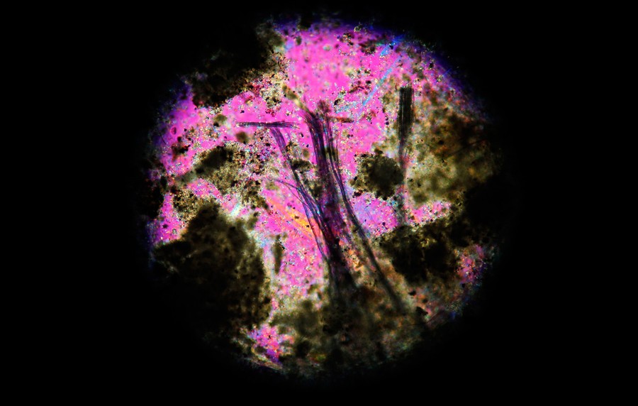 Read moreCrocidolite, a type of asbestos is seen on a material through a lens of a polarized light microscope at a makeshift laboratory where EFA Laboratory manager Eric Eguina works in Sendai, Miyagi Prefecture, northeastern Japan on April 22, 2011 photo. Chrysotile, another type of asbestos, orange color seen next to the blue crocidolite, is also found on the material. #