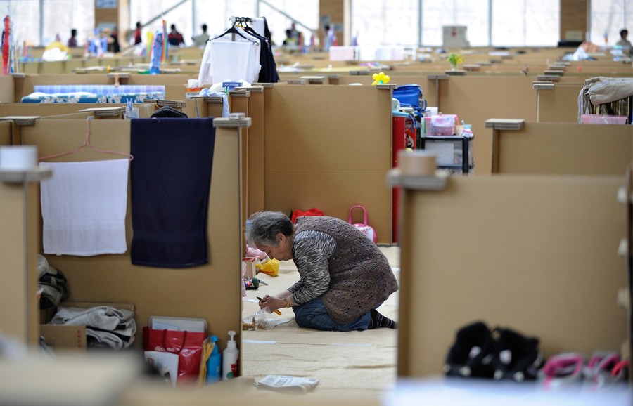 Read moreA woman prepares lunch in her small partitioned unit divided by cardboard walls, at an evacuation center for people effected by the March 11 earthquake and tsunami in Miyako, Iwate Prefecture, on April 21, 2011. #