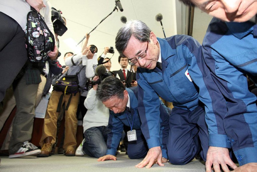 Read moreTokyo Power Electric Co., (TEPCO) President Masataka Shimizu kneels and bows deeply, in apology, toward evacuated Namie Town residents at Nihonmatsu City Hall Towa Branch on May 4, 2011 in Nihonmatsu, Fukushima, Japan. #