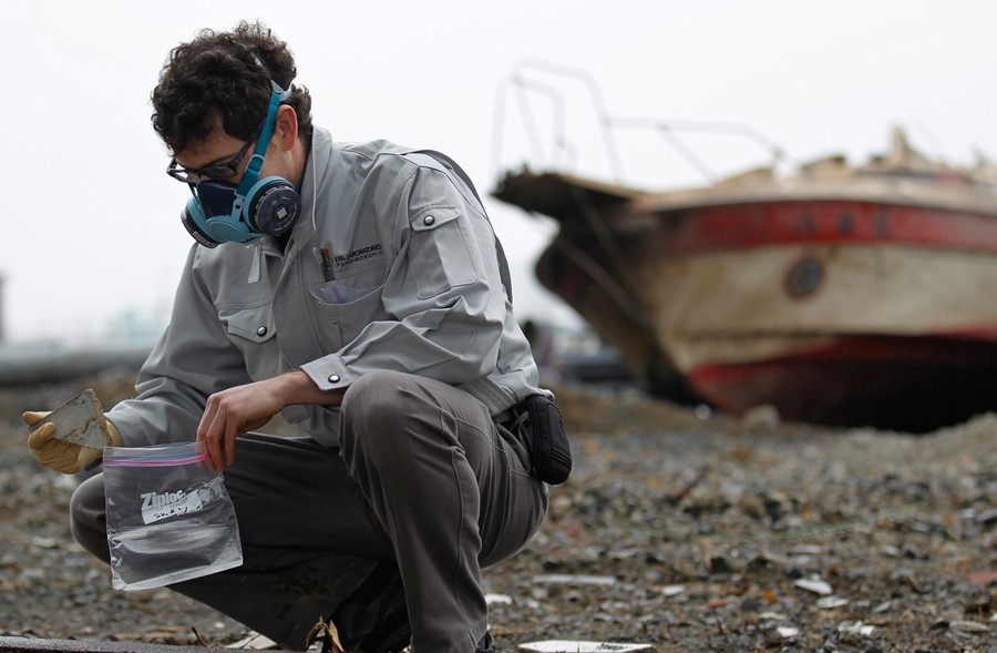 Read moreEFA Laboratory manager Eric Eguina puts sample material in a plastic bag while looking for materials possibly containing asbestos in an area devastated by the March 11 tsunami in Shiogama, Miyagi Prefecture, northeastern Japan on April 22, 2011. Inside the chunks of slate and wallboard smashed and scattered by Japan's tsunami hides a health risk that has been overshadowed by contamination from a leaking nuclear plant: the odorless and nearly invisible threat of asbestos. #