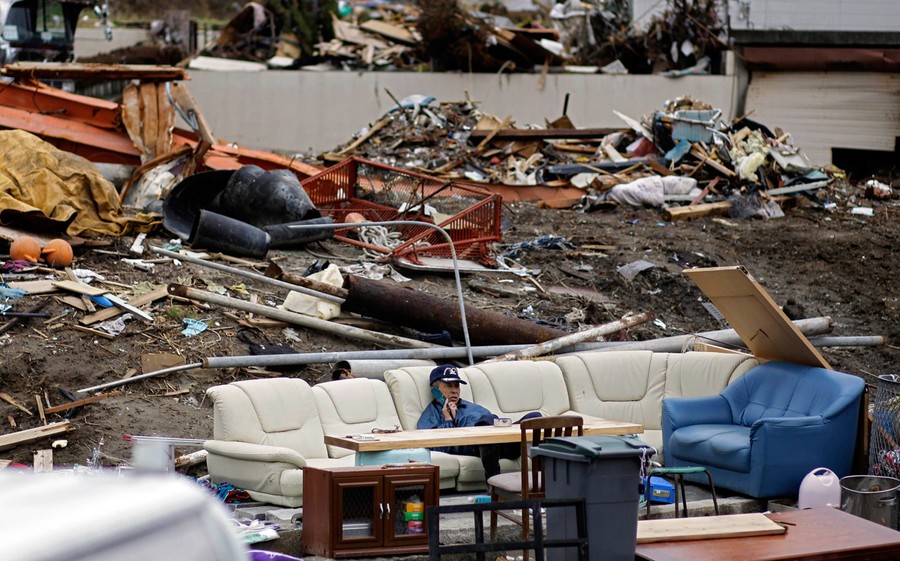 Read moreA man talks on his cell phone as he sits on a sofa among the rubble in the area devastated by March 11 earthquake and tsunami in the town of Soma, Fukushima Prefecture, Japan, on Saturday, April 23, 2011. #