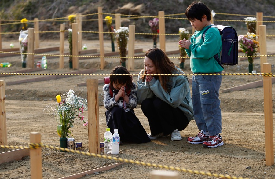 Read moreWakana Kumagai prays with her mother Yoshiko and brother Koki in front of the grave of her father, who was killed by the March 11 tsunami, at a temporary mass grave site in Higashi-Matsushima, Miyagi prefecture, April 21, 2011. Her father, Kazuyuki, called his wife Yoshiko just after the March 11 earthquake to tell her to take the children to Omagari elementary school which was serving as a shelter. He was found near the shelter four days after the tsunami, Yoshiko said. #