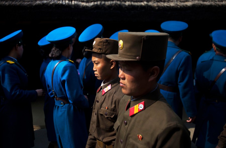 Read moreNorth Korean soldiers, foreground, and North Korean traffic police, background, tour the birthplace of Kim Il Sung to pay their respects at Mangyongdae, North Korea, on April 13, 2011. #