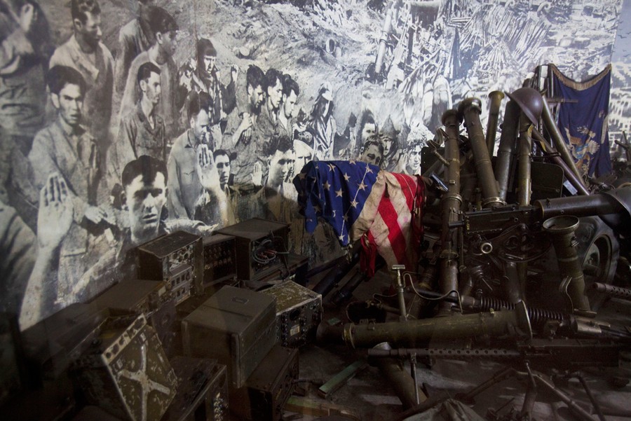 Read moreA photograph of Kim Il Sung hangs on a wall next to a light made from a grenade inside an exhibit, made to look like underground bunkers used during the resistance against the Japanese occupation, at the war museum in Pyongyang, North Korea, on March 9, 2011. #