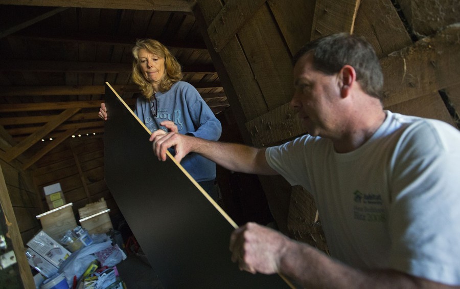 Read moreJeanie Nice and her husband Jeff Nice carry parts for a shelving unit into their barn on their farm in Kinston, North Carolina, on December 14, 2012. After completion of a government contact working in computers Jeff has spent most of his time on the farm tending to the livestock and general chores such as planting grass or keeping his equipment in working order. On the farm is a 200 yard rifle range where Jeff teaches hunter education and gun safety. #