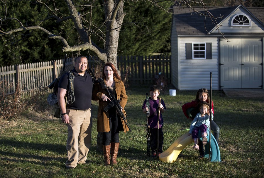 Read moreJay Blevins and his wife Holly Blevins and their children Samuel Benjamin Blevins, 7, Elliana Grace Blevins, 9, and Evangeline Joy Blevins, 4, pose beneath one of their apple trees with survival gear including an AR-15 rifle and a hunting bow, on December 5, 2012 in Berryville, Virginia. Blevins and his wife have been preparing with a group of others for a possible doomsday scenario where the group will have to be self sufficient due to catastrophe or civil unrest. #