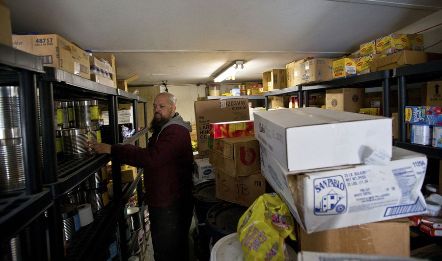 Read moreMike Holland reviews his stock of dry food storage in a trailer at the Holland family property in Warrenton, North Carolina, on December 13, 2012. Prepper Mike Holland lives with his wife, four children and three other men on their 13 acre property where they raise, chickens, turkeys, goats and a cow for milk. In addition to livestock they also have a greenhouse and a few trailers that house food storage including multiple freezers. Outside of food preparations Holland has ammunition and firearms, a safe room, security cameras and a military grade generator for power. #