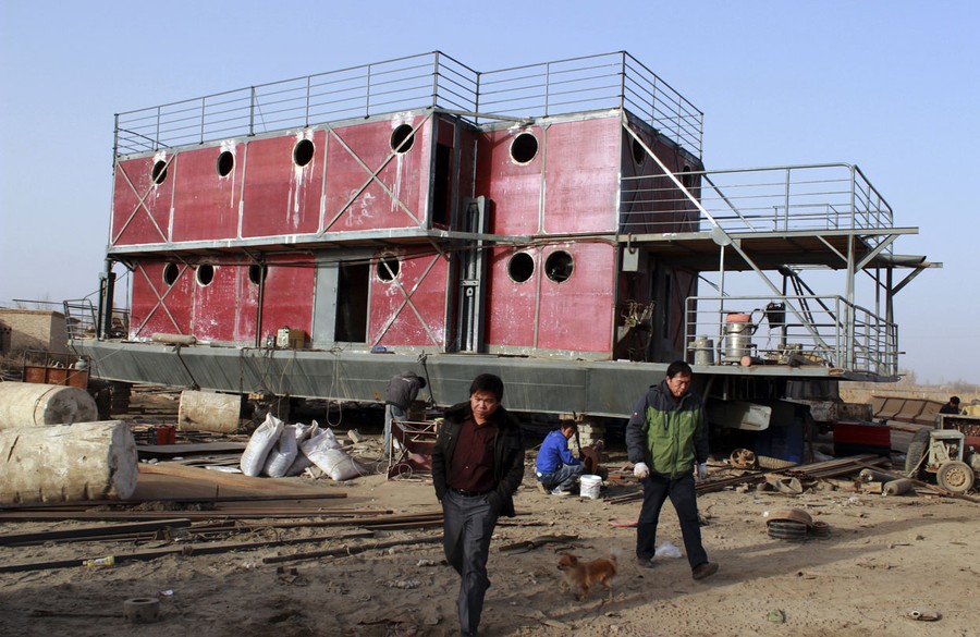 Read moreLu Zhenghai, right, walks near his ark-like vessel under construction in China's northwest Xinjiang Uyghur Autonomous Region, on November 24, 2012. Lu Zhenghai is one of at least two men in China predicting a world-ending flood, come December 21, the fateful day many believe the Maya set as the conclusion of their 5,125-year long-count calendar. Zhenghai has spent his life savings building the 70-foot-by-50-foot vessel powered by three diesel engines, according to state media. #