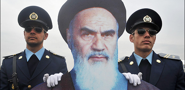 A larger-than-life, but not actually alive, Ruhollah Khomeini is trotted our for a very special military ceremony.