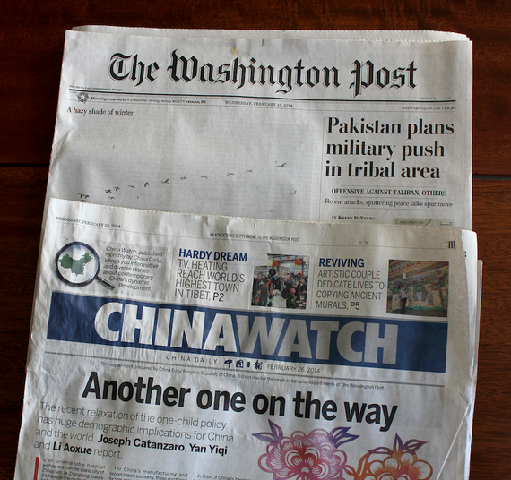 So drollery about "my favorite newspaper" doesn't seem as droll any more. And although I understand all the logical reasons why China Daily should be able to piggyback on the Washington Post -- it's a free country, the material is marked as a special supplement, closing down info is never a good answer, the WaPo needs the money -- the contrast is grating. At a time when China is trying to keep foreign reporters from even entering its country, it's injecting a direct shot of Chinese-government perspective into our capital-city papers. This is not "dangerous" in any way, but it's annoying.