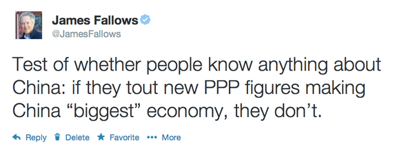 Headlines and reactions like these are ridiculous, as I'm sure both publications are aware and as each of the articles concedes further down in the stories. Compared with one week ago, when China's economy was much "smaller" than America's, nothing economic has changed in either China or the United States. With these new figures, we may have a closer approximation of how circumstances for China's recently urbanized hundreds-of-millions compare with others around the globe. But the differences not captured by such figures—freedom to or restrictions on travel within a country, who can and cannot go to school, the still-unfolding enormous effects of mass urbanization, the nature and availability of health-care systems, above all the country's environmental catastrophe—are also part of any serious attempt to understand how "rich" or "poor" China is.