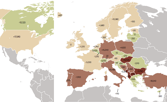 Absolute increase or decrease in asylum claims in 2013 compared with 2012. Dark brown indicates an increase of more than 100 percent, and lighter brown an increase between 50 and 100 percent. Green indicates a decrease. (UNHCR)