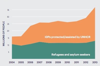 Not since World War II have there been so many refugees or IDPs. (Finding definitive numbers is tough, but the UN reports that the number of refugees and IDPs last exceeded 50 million during the Second World War, an astonishing figure given that the global population was significantly smaller then.) The annual Global Peace Index, released on Wednesday and based on the number of refugees and IDPs recorded through the end of 2013, offers some more detail about how the number got so high. Most of the growth in that period was actually not from refugees—that number had grown a comparatively scant 23 percent between 2004 and 2013—but among IDPs, or those uprooted within their home country, whose ranks had swelled by more than 300 percent since in that time.