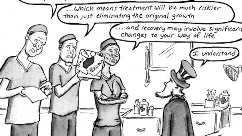 This cartoon originally appeared as “Bitter Pill” the week after the terrorist attacks of 9/11. Now, following the attacks of last week, France, too, must wrestle with these issues, as the United States—now facing newly issued threats, the growing challenges of encrypted communications, and the resettlement of a wave of Syrian refugees—also continues to do.