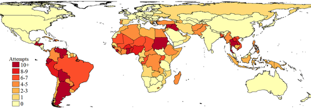 Last year, the political scientist Jay Ulfelder combined two datasets, that of Powell and Thyne and another by the Center for Systemic Peace, to plot the number of coup attempts around the world over time. There is no one definition of a “coup,” but Ulfelder described the type of incident that qualified for inclusion in the chart below as “a forceful seizure of national political authority by military or political insiders.”