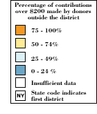 Districts in which the majority of individual contributions come from outside illustrate what analysts call the "dual constituency" problem, which divides a representative's attention between residents of his or her district and others, who make their interests known through campaign contributions. There are a number of possible explanations for why donors reach across district lines. They may have material interests in a district other than the one in which they reside, or they may be seeking to extend their sphere of influence into a poorer neighboring district. For example, in the four-way race for the New York ninth district, which winds through less-affluent neighborhoods in Brooklyn and Queens, 86 percent of all individual donations of $200 or more came from outsiders -- nearly $70,000 from residents of the Upper West Side of Manhattan alone. Elsewhere high levels of outside contributions may reflect highly politicized races in which disproportionate amounts of money were donated by either the right or the left. In Idaho's contentious first-district contest between the Republican incumbent, Helen Chenoweth, and the Democratic challenger, Daniel Williams, almost 50 percent of Chenoweth's and 80 percent of Williams's large individual donations came from outside their district. Ultimately, Williams's outside funding was not enough to overcome the disparity in spending -- Chenoweth spent a total of $1,331,487 to Williams's $876,308 -- and unseat an incumbent in a Republican state.