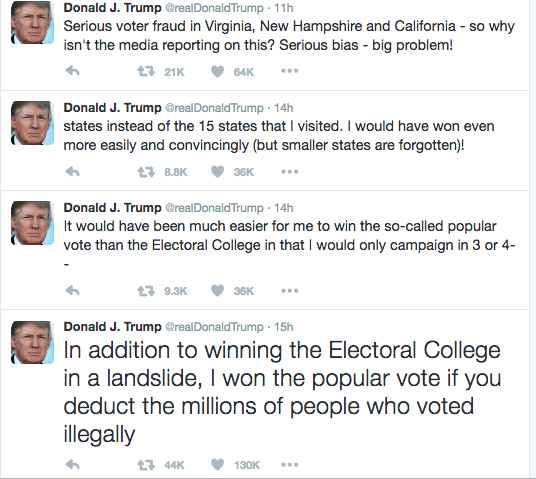 President-Elect Donald Trump baselessly claimed that “millions” of Americans voted illegally in the 2016 election Sunday night, apparently spurred on by his loss in the popular vote and Green Party nominee Jill Stein’s efforts to seek a recount in several close states Trump won.