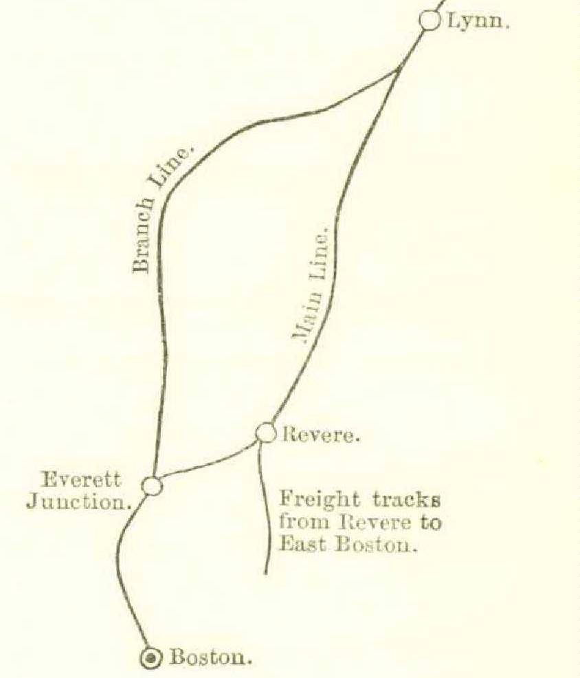 The Eastern Railroad of Massachusetts connects Boston with Portland, in the State of Maine, by a line which' is located close along the sea-shore. Between Boston and Lynn, a distance of eleven miles, the main road is in large part built across the salt marshes, but there is a branch which leaves it at Everett, a small station some miles out of Boston, and thence, running deviously through a succession of towns on the higher ground, connects with the main track again at Lynn; thus making what is known in England as a loop-road. At