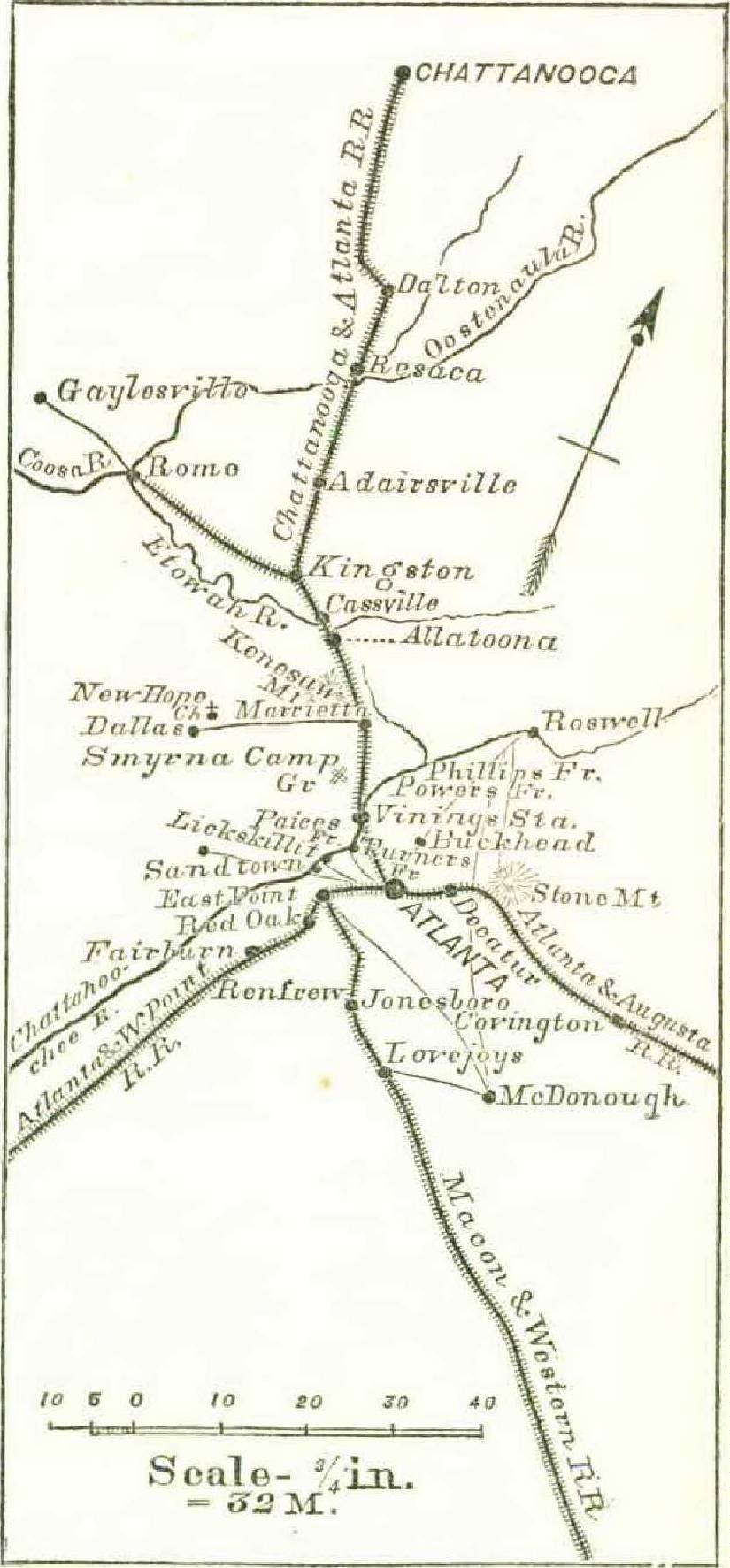 Atlanta being a city of considerable size, no one is likely to have, before visiting it, a conception of the rough character of the approaches to it. There are no plains about it. The country is rolling and thickly wooded. The undergrowth is dense, with a few openings for cultivation. The creeks cut deep and run crooked. It is just the country to bring on a rough-and-tumble fight between hostile forces, where neither commander can anticipate precisely the place or the time of the conflict.