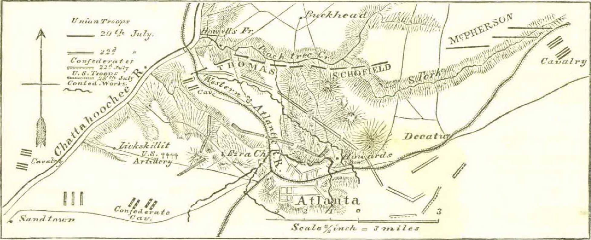 General Giles A. Smith, a clear-headed, self-possessed soldier, who, it will be remembered, became Assistant Postmaster-General after the war, was assigned to the division of Gresham on the latter being disabled by his wound. The ridge terminating in what, since Leggett’s combat for it, has been called Leggett’s Hill, formed the left of the general line. We now had every part of Sherman’s force, except the cavalry, in position facing Atlanta and connected from left to right: McPherson’s command including Blair, Logan, and Dodge (the latter’s force mainly in reserve); Schofield’s, the twenty-third corps (Cox’s), and a few other troops; Thomas’s, the fourth (Howard), twentieth (Hooker), and fourteenth (Palmer); the whole extending around almost a semicircle from Leggett’s Hill, just south of the Atlanta and Augusta railroad, to the south of the Chattanooga and Atlanta railroad.