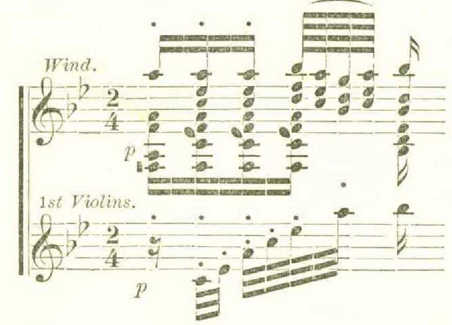 A fair proportion of the strings to the rest of the orchestra would be : ten violins on a part for the Beethoven symphony, and fifteen violins (at least) on a part for the Wagner piece. Doubling3 the remaining string-parts in a corresponding ratio, we should have in one case an orchestra of fifty-five performers, and in the other case an orchestra of eighty-seven performers. This is at least a prima facie evidence that Wagner’s prelude is suited to a larger hall than Beethoven’s symphony. When we compare the masses of brass instruments in the two scores, this difference is all the more striking. Of course it is possible to put a larger force of strings upon the symphony; this is often done ; but it must be remembered that this will destroy the dynamic balance of the score. If we are to have as large a mass of strings in the symphony as in the Wagner piece, the wind-parts (with the possible exception of the trumpets) will be covered up. The orchestra of the Royal Opera in Berlin is the only one we know of in which the flutes and reeds in classical scores are so arranged as to counterbalance a large mass of strings in strong passages. Each pair of wooden wind instruments is reënforced by a second pair (ripieni) which play only in the tutti passages.4 If this method were adopted in all large orchestras, the question of playing classical orchestral works in large halls would be solved satisfactorily at once; but it is not. In America, where we have the largest concert-halls, it is very rarely that we have even a large body of strings. We continually hear works given by orchestras of fifty or sixty performers in halls that would require an orchestra of very unusual size. The reader will notice that we have hinted that the usual four pairs of wooden wind instruments are unable to cope with a large mass of strings in strong passages. This brings us to a very delicate point, which is too little noticed. The strings, especially the violins, are the part of an orchestra which most loses in intensity of tone by being heard in a large hall; or, as Berlioz would say, the musical fluid generated by the strings loses its power at the shortest distance from its point of departure. Thus it happens that, although the dynamic balance of the strings and reeds in an orchestra of fifty-live performers,5 playing at its mean degree of loudness (that is, mezzoforte) may be perfect in a small or moderate-sized hall, this equilibrium will be destroyed in a large hall. The violins lose the telling quality of their tone before the wind instruments do. Many delicate passages for the strings are thus covered up by the wind. We have listened attentively, often score in hand, to Beethoven’s Eighth Symphony (in F major), but we have never yet even heard the violins in the following passage, when the symphony was given in a large hall.