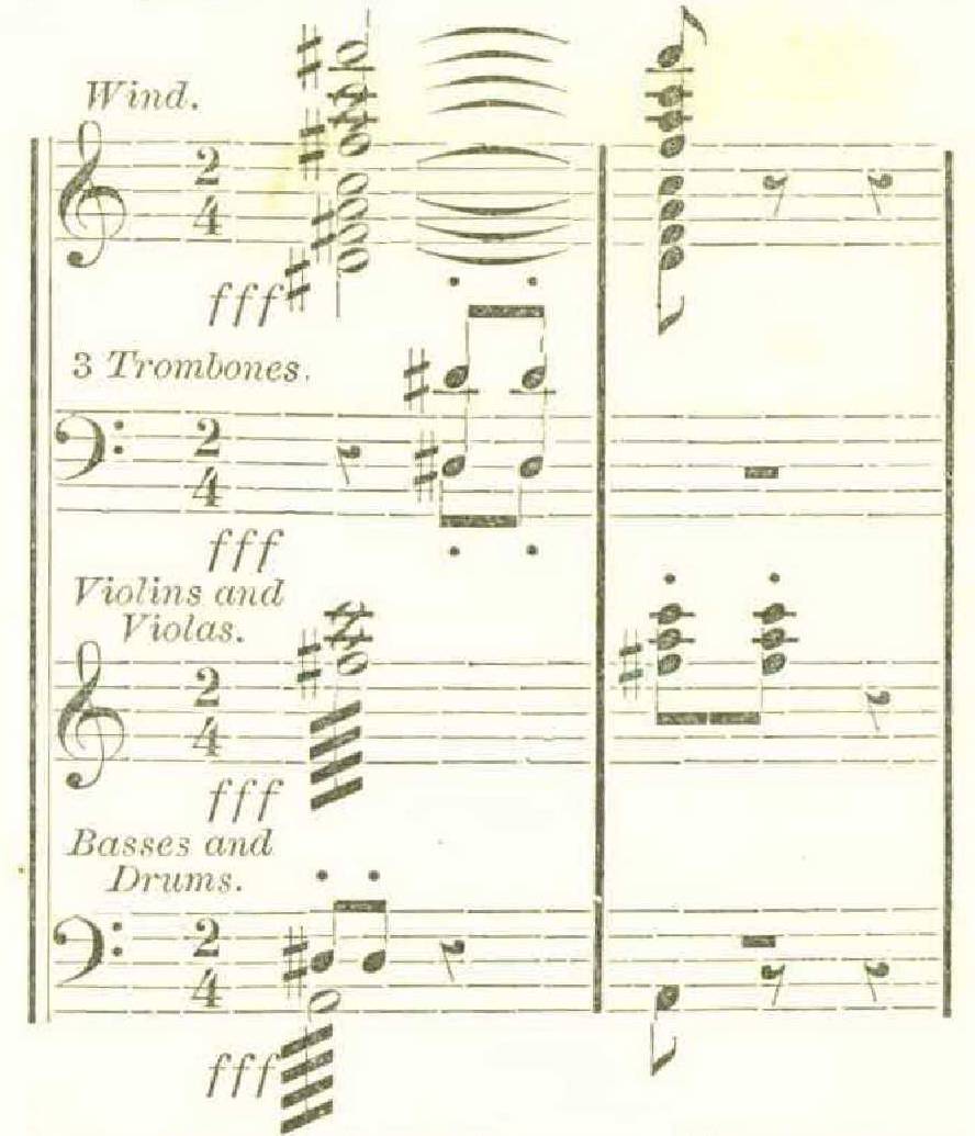 It may be taken for granted that, in general, those compositions for which a large mass of performers (either vocal or instrumental) is required are more suited to large halls than works which require a more modest number of executants. Wagner’s prelude to Tristan und Isolde, or Liszt’s Tasso, will produce their full effect upon the listener in a hall where a Haydn symphony would lose much of its brilliancy. But here we come to a point concerning which the musical public at large has, it must be admitted, very unmusical ideas. There is no lack of musical persons who will readily admit that a large hall is no proper place for piano-forte sonatas, string quartettes, or other chamber music; if a Rubinstein or a Von Bülow is forced by outside circumstances to give chamber-concerts in large halls, they are glad enough to go to hear him, yet they will at the same time he as ready to appreciate how much they lose from the size of the hall, as any musician can be. But when it is a question of listening to symphonies or concert overtures, the public seems to lose sight of distinctions which are yet of great importance. A symphony is a symphony, it is said, and the largest hall must of necessity suit the largest form of orchestral composition. The fallacy of this doctrine is easily shown. Largeness of form in a composition does not necessarily imply largeness of orchestral means. Compare the scores of the two following compositions, one in the largest symphonic form, and the other in a comparatively small musical form.
