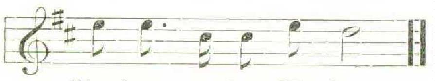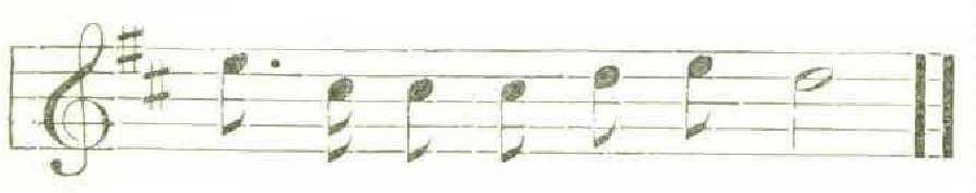 I took it clown on paper right out of his mouth, and all the orioles I happened to hear for a long time after gave the same number and arrangement of notes, with the same rhythm, like a bugle-call. Then — very gradually it came about — I learned to listen for a variation in this perfect musical phrase. It was at the beginning of my interest in birds, and, being without assistance from people or books, it took me some years to recognize their songs by the tones, not by the themes. Thus I lost mv orioles for a time, often thinking I was listening to some other bird. Then discovering that there were two kinds of oriole, I naturally explained the difference to myself by this fact. But the orchard oriole is by no means a common bird in our region, and now, as the result of watching the gay and gorgeous individual of the Baltimore class that builds year after year outside my window, I am convinced that these birds never give quite the same song for many consecutive seasons. For a number of years this outdoor neighbor of mine used to come with the following cheerful greeting, — cheerful, with a pretty slurring note of sentiment : —
