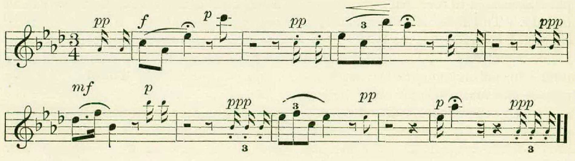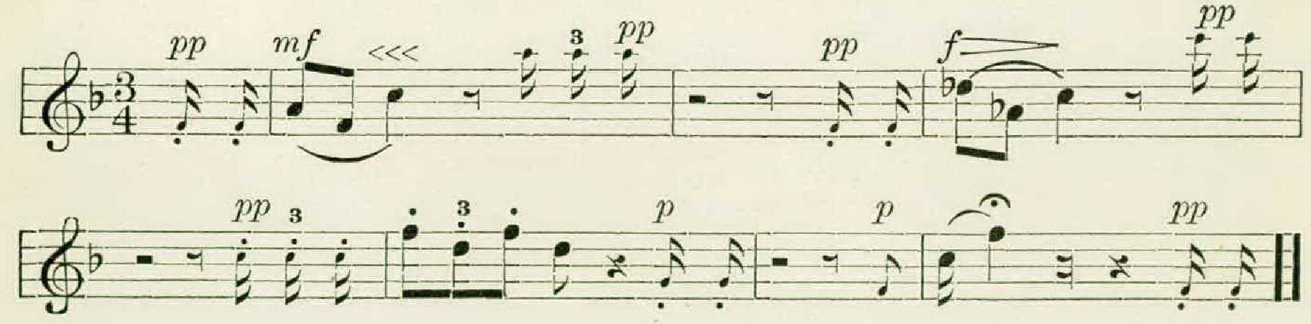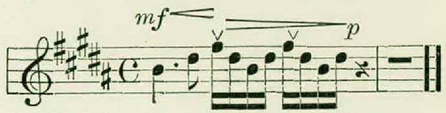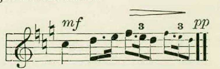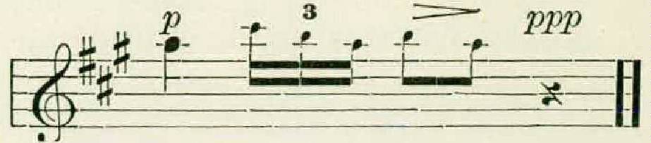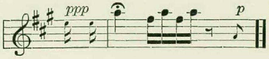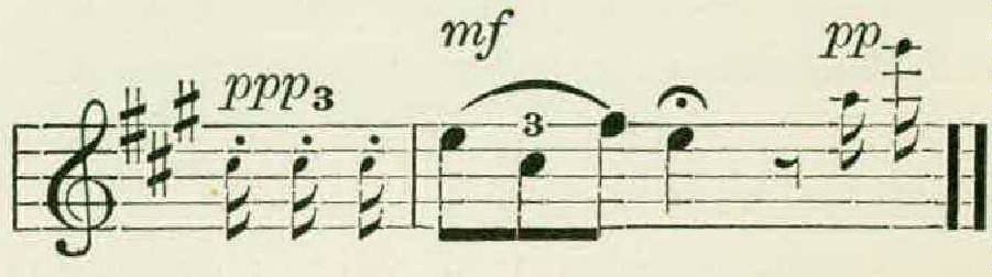 Each thrush, it appeared, had from eight to eleven separate phrases, and these, unlike the figures of the wood thrush, were in several different keys, and were all approximately of the same form. This typical hermit thrush theme consisted of a long opening note, followed by two or more groups of rapid notes higher on the scale, as in the following example: —