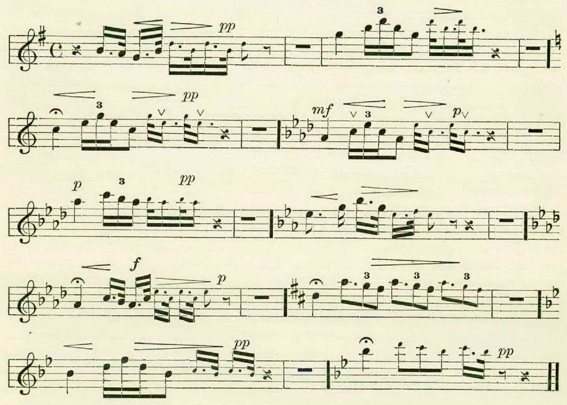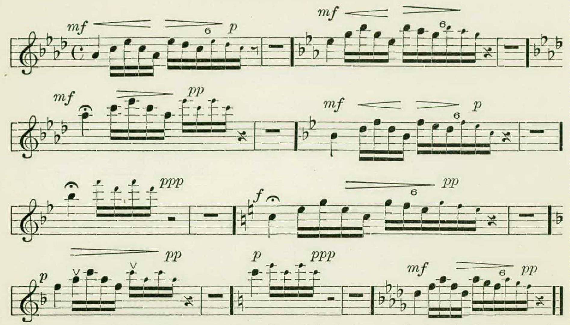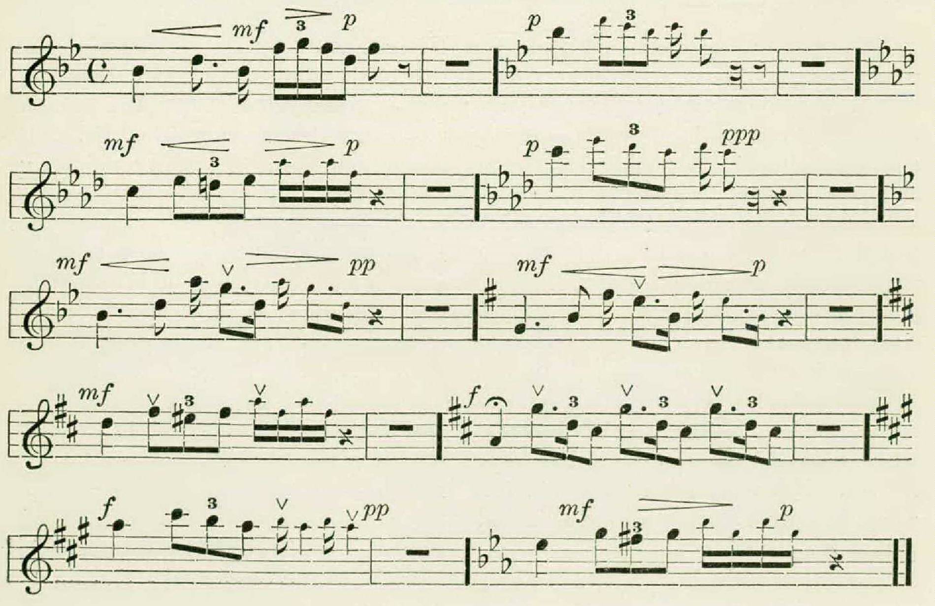 Here is another singer, with four phrases, who signalized himself by introducing flats, thereby making a modulation into the minor of his original key.
