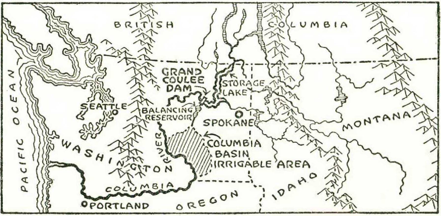I reached the site from Spokane by motor in about two hours. We crossed a dry, rolling plain, with a few prosperous farms and the scars of much erosion. It is always difficult for an Easterner to realize that east of the Cascade Mountains, which are not far from the coast, large sections of Washington and Oregon are natural cow country, arid as the Great Plains. The stereotype of the Northwest is a mixture of snowcapped mountains, towering fir trees, leaping waterfalls, and soaking rain. This is true enough of the coast, but one hundred per cent wrong for much of the interior, where you find flat lands, sagebrush, bunch grass, and a ten-inch rainfall. Incidentally these areas, through overgrazing and overploughing for wheat, were rapidly turning into a nice little dust bowl until the men of the Soil Conservation Service went into action.