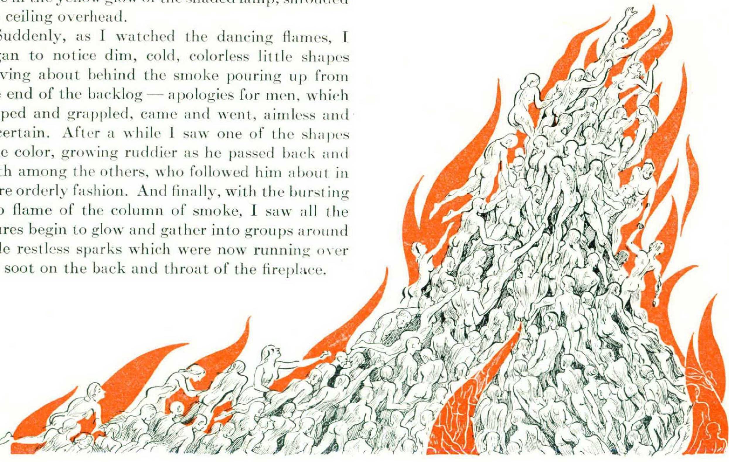Suddenly, as I watched the dancing flames, I began to notice dim, cold, colorless little shapes moving about behind the smoke pouring up from one end of the backlog—apologies for men, which groped and grappled, came and went, aimless and uncertain. After a while I saw one of the shapes take color, growing ruddier as he passed hack and forth among the others, who followed him about in more orderly fashion. And finally, with the bursting into flame of the column of smoke, I saw all the figures begin to glow and gather into groups around little restless sparks which were now running over the soot on the back and throat of the flreph