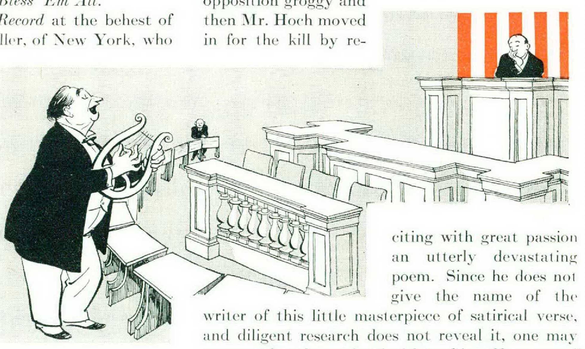 The impact of this stinging anecdote made the opposition groggy and then Mr. Hoch moved in for the kill by reciting with great passion an utterly devastating poem. Since he does not give the name of the writer of this little masterpiece of satirical verso, and diligent research does not reveal it, one may suppose that the modest legislator himself composed the poem which he gave to the nation and to the House on a memorable afternoon of high debate: -