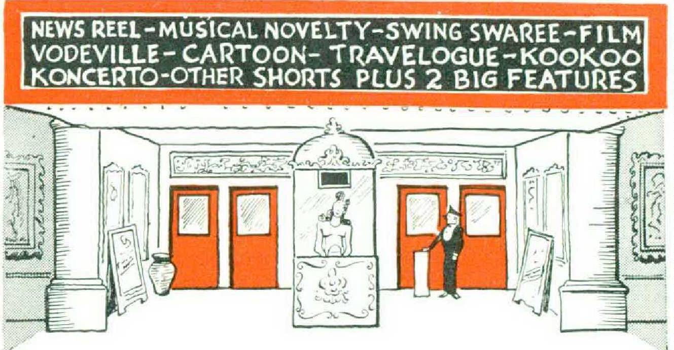 Once, shorts of this type were called “chasers and thrown on the screen in the event of fire or civil disturbance. Nowadays only hunger will drive a patron out of his seat, and he need go no further than the inner foyer, where there is a candy counter heaped with nutritious Turkish Delight and highly vitaminized nut bars.