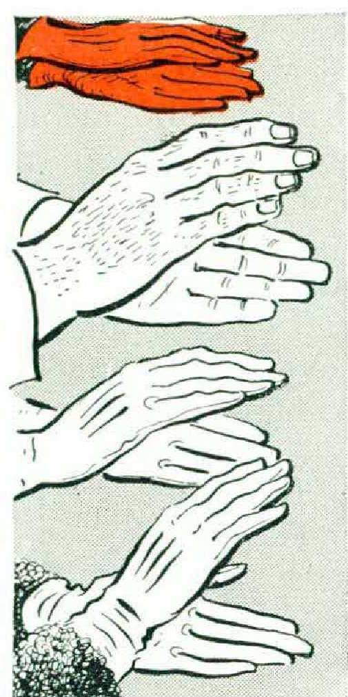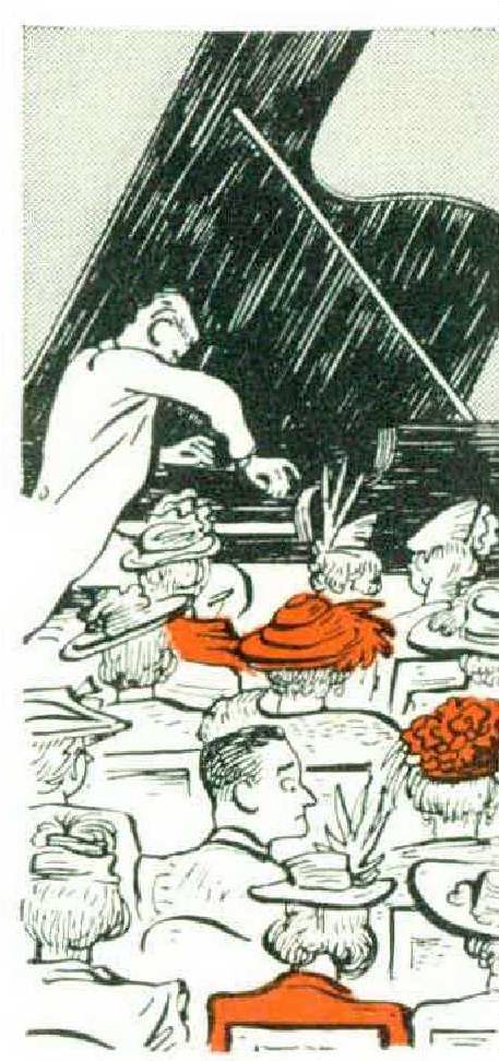 The crowd of women became more intimidat ing by the moment, and my courage ebbed to nothing. I was about to admit defeat and to slip quietly away when a large, forceful-looking woman suddenly disengaged herself from the throng and bore down on me, hat on high and furs flying. She grasped me by the right elbow and asked eagerly if I wanted to hear the concert. Trying unobtrusively to free myself, I mumbled that I had wanted to hear the pianist, but that under t he circumstances I — well, I’d probably be happier elsewhere.