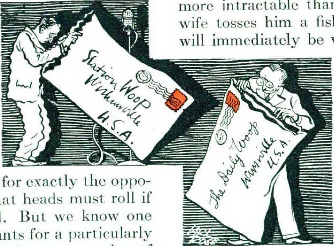 Our author Frances Eisenberg (page 139) reports on how the inner councils of radio networks react to the constant possibility of getting a Letter. One gathers that they take these things rather seriously in radio. Newspapers take Letters just as seriously, of course, but sometimes for exactly the opposite reason. Radio may feel that heads must roll if even a single squawk is heard. But we know one newspaper publisher who accounts for a particularly idiotic columnist in his pages by the great number of denunciatory letters provoked by the column. The letters show, he says, that people are reading the column. This makes him very happy, although the amount of paper thus wasted by his columnist and the correspondents in the course of a year is obviously enormous.