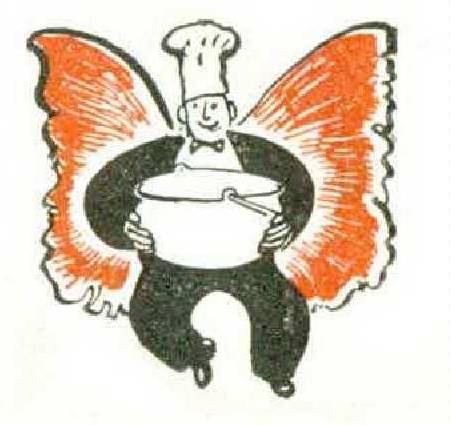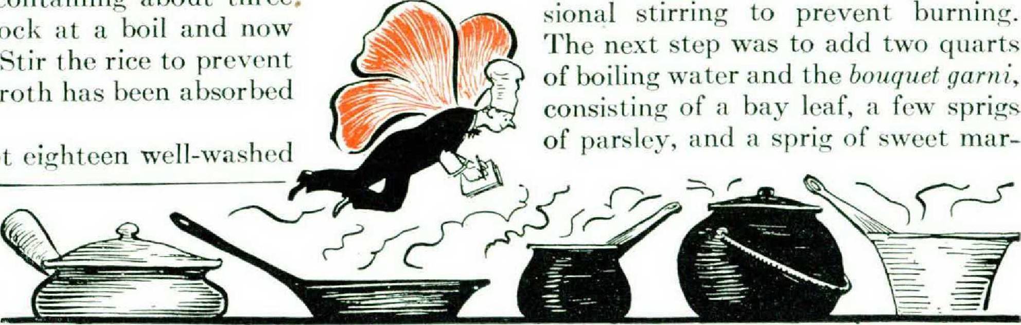 The cleaned chicken was disjointed, lightly rubbed with pepper and salt, and set aside for about an hour. Then Irene heated the oil in a good-sized saucepan and added the onion and garlic and let them cook until the onion was a golden color. Next the pieces of chicken went into the pot, and the pot was covered. When the chicken was browned on one side the pieces were turned over to allow the same light browning to take place on the other. The raw rice was then thoroughly washed, drained, and dried. It went into the pot along with the ham. The pot was again covered and the frying process continued over low heat for about fifteen minutes, with occasional stirring to prevent burning. The next step was to add two quarts of boiling water and the bouquet garni, consisting of a bay leaf, a few sprigs of parsley, and a sprig of sweet marjoram. (If marjoram is not available a stalk of celery may be used.) The liquid was allowed to bubble gently until the chicken was tender and ready to drop from the bones. At this point Irene took the chicken pieces from the pot, removed all bones, tendons, and skin, and cut the meat into small pieces, which rejoined the soup. Another five minutes of simmering and it was ready for service in hot earthenware bowls, garnished with chopped parsley.