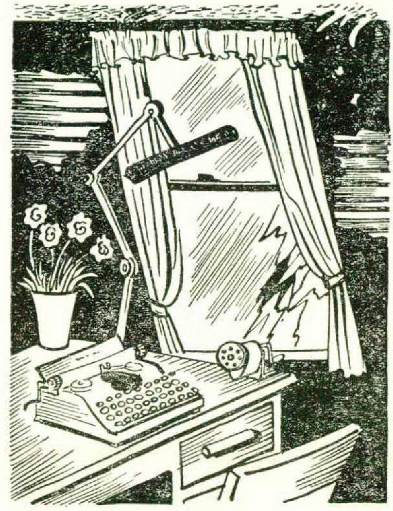 The desk and typewriter used to be lit haphazardly from the living-room window, and on gray days we just strained our eyes and hoped our touch typing was more accurate than we knew it was. Now, clamped to the back of the desk, and soaring up in an incredible steel structure, is a Dazor Floating Fluorescent Lamp, which casts on the FingerFlow Keyboard of the typewriter the brilliant cold light and low watt consumption of the modern world. The lamp is breath-takingly suspended from about five feet of metal tubes, springs, elbow joints, universal joints, sockets, bolts, wing nuts, and God knows what else. Wherever you place it, it mysteriously stays, suspended but unmoving, really putting light where you want it, and making the rest of the lamps in the room look like props for a Technicolor movie of the Civil War.