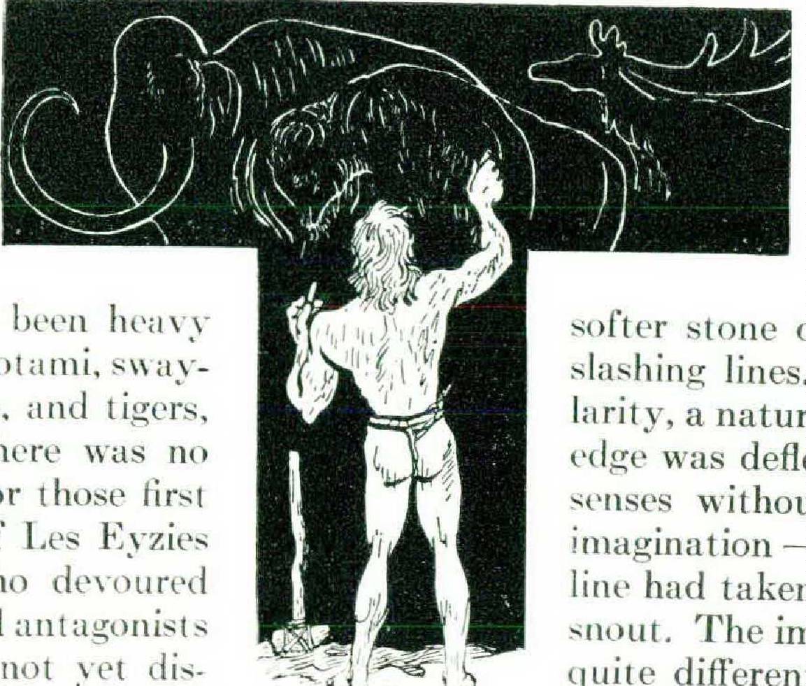 There is a small ledge of rock on which, twenty, thirty thousand years ago, sat men of a newer race. They wore tall now. Their jaws no longer jutted as had those of their predecessors. While the storms raged unheard outside, in the dim glow of little fires they struck useful shape into the unyielding flint just as men always had. The chips still lie there on the floor. As the instruments took shape, the sharpness of their edges were tried in the softer stone of the cave wall, in careless, slashing lines. Here, there was an irregularity, a natural protuberance. The cutting edge was deflected. The toolmaker — one senses without too much forcing of the imagination — saw that by chance the cut line had taken on a likeness to a reindeer’s snout, The image pleased him. With finer, quite different strokes he completed with deliberation what hazard had begun.