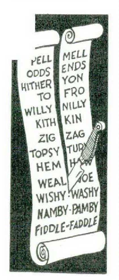 (As a result of my frenzied plungings about in the dictionary during the past couple of weeks, I am perhaps the only living man outside the directorate of a Philological Society who knows that pell-mell comes from Old French and means “stirred up with a shovel.” Poor old Halfway is stirred up, all right, but I can’t for the life of me see that there is any shovel — pesle, Old Fr. — involved in the business; so, as I say, he just goes running away down the street very fast, mell).