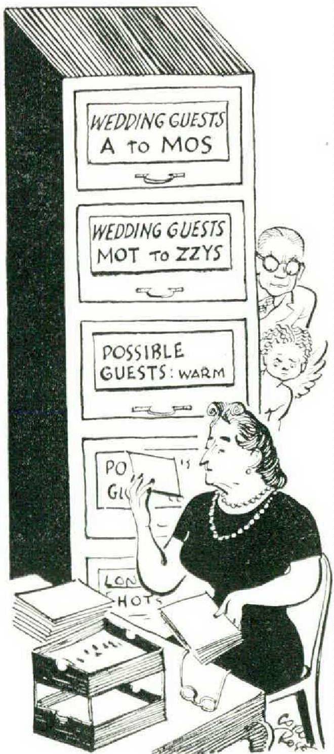 The Australian tracker has no keener eye than the bride’s mother. She can discern the spoor of a wedding guest from no more than a dislocated pebble, a fallen leaf, or a casual conversation with a stranger on a bathing beach. Ranging widely for fifteen or twenty years of search, she sweeps before her the greatest possible number of prospective wedding guests and ultimately confines them, some thousands by this time, in a stout card file. Here the weaklings and the unfit are culled out, and the others the live names — are herded into improvised categories, roughly according to tenderness, wealth, consanguinity, and quid pro quo.