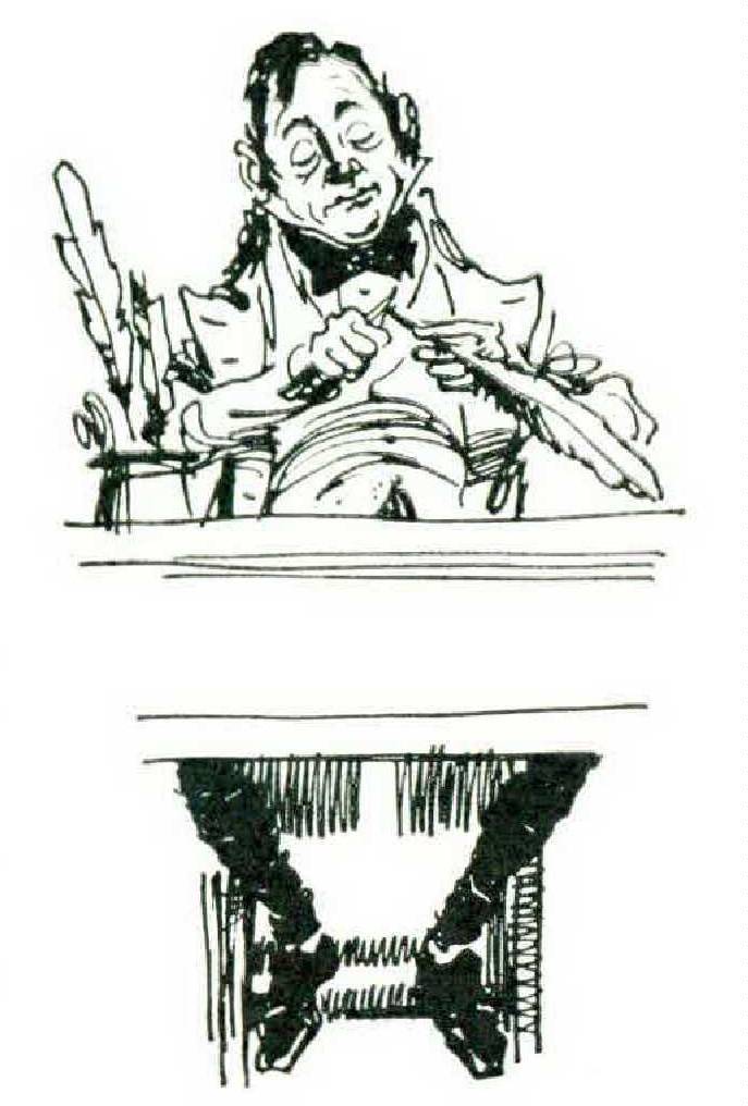 Things hardly improved when on April 20, two days after he and Dickens had met for the first and only time, the artist Seymour committed suicide, He died, quite in character for a maker of sporting sketches, by pulling a string attached to a loaded fowling piece. A pathetic claim was later made by his distracted widow thill her husband had been the “originator” of Mr. Pickwick. In 1927 a letter of Dickens dealing with this claim sold for $2800 — a crass commentary on the relative importance of Dickens and his first illustrator. It is true, however, that in a book which Seymour had illustrated previous to Pickwick — it was called Maxims and Hints for an Angler — you will find a character who looks vaguely like Mr. Pickwick, one who slightly resembles Jingle, one even more remotely recalling Sam Weller.